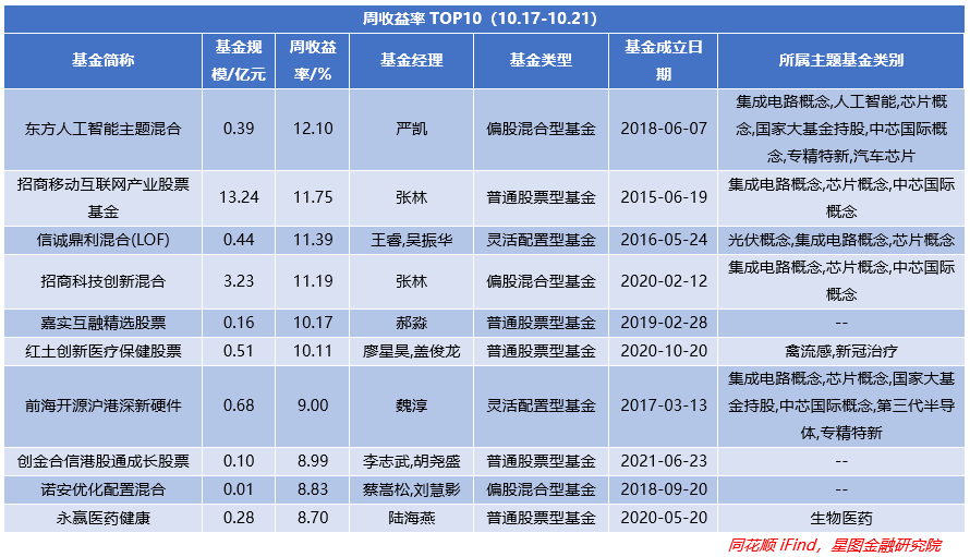 从涨跌幅(A/C基金以A类或排名靠前为准)TOP10来看,被权益型型基表现最好,共计7只基金上榜,其余为2只QDII型基金、1只指数型基金,整体涨幅也有所回踩,环比-2.8pct。而且最高涨幅下滑4.3pct至12.18%,为中信保诚基金旗下LOF型基金,同时需要注意的是表现较好的基金同信息技术、医疗相关,主要受政策面引导以及市场轮动。