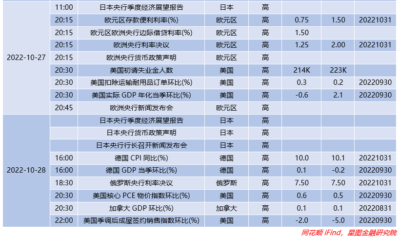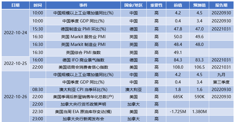 欧洲方面,欧元区9月CPI同比增长9.9%,预估为10.0%,初值为9.1%。欧元区9月消费者物价调和指数较前月上涨1.2%。德国9月PPI同比上升45.8%,预期44.7%,前值45.80%;9月PPI环比上升2.3%,预期1.3%,前值7.90%;2年期国债收益率创2008年12月以来最高,为2.128%,当日上涨5.5个基点。英国9月CPI同比增长10.1%,预期10.00%,前值9.90%;在大规模减税计划引发市场巨震后,不合时宜的“特 拉斯经济学”宣告终结,特 拉斯也于10月20日辞职,英国权力再一次真空,国际货币基金组织(IMF)10月最新的预测,预计英国2022年经济增速为3.6%,到2023年将大幅下降至0.3%。目前市场对英国央行下个月加息75个基点的押注上升至92%,经济下行压力巨大。。