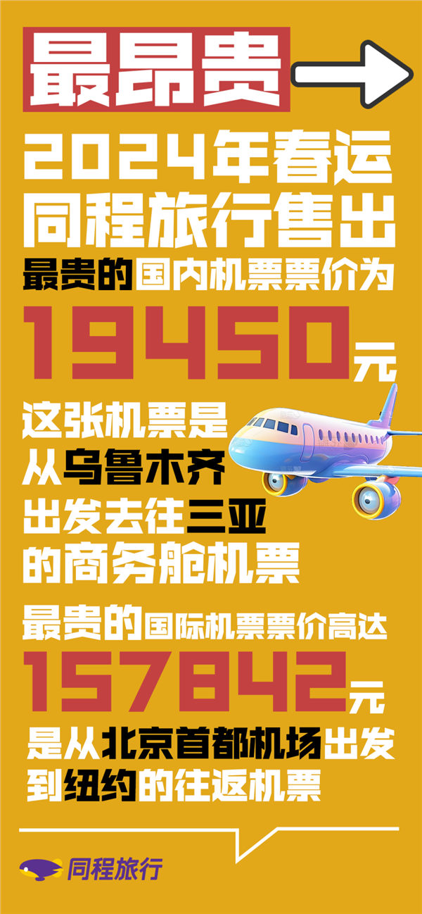 同程旅行数据显示,截至目前,同程旅行售出客单价最高的机票,是乌鲁木齐飞往三亚的商务舱机票,票价为19450元。春运期间最贵的国际机票是北京首都机场出发到纽约的往返机票,春运期间去一趟纽约,这为旅客花费了157842元。