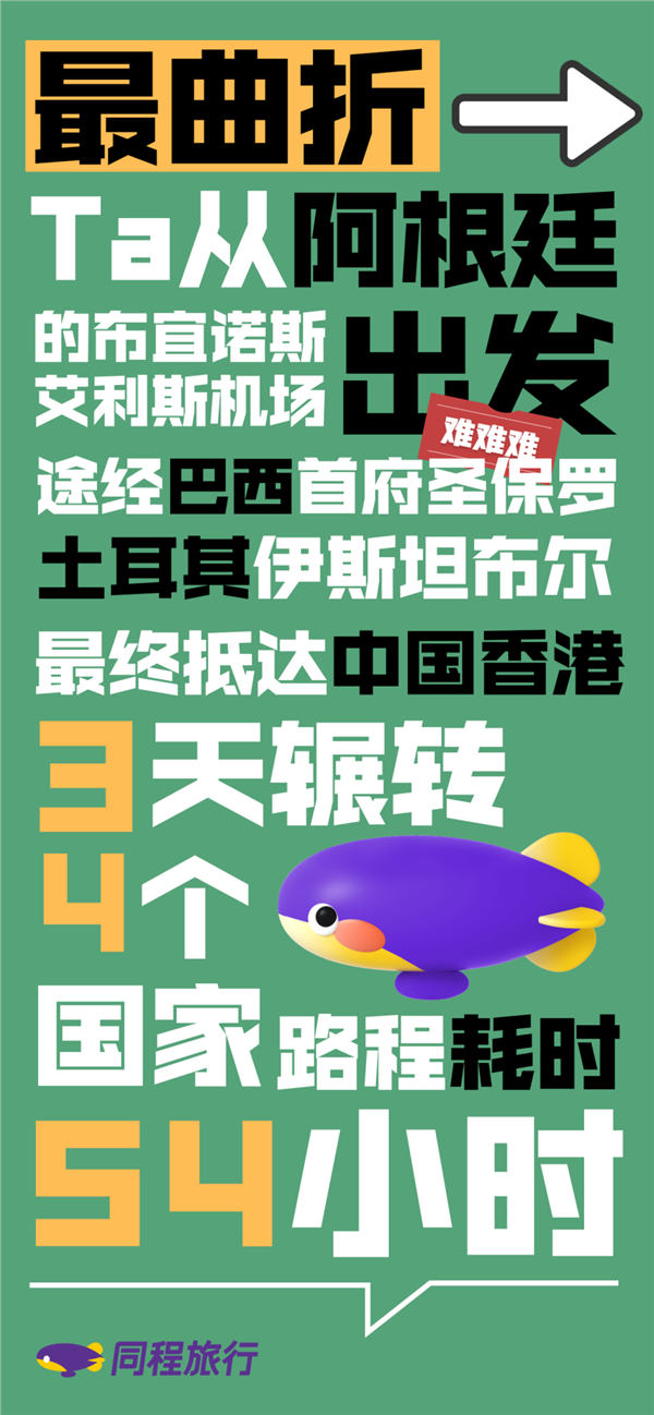 同程旅行平台上,一位用户从阿根廷布宜诺斯艾利斯出发,途径巴西首府圣保罗和土耳其的伊斯坦布尔,最终抵达中国香港。在3天之内耗时54小时辗转4个国家,堪称春运期间最曲折的返乡路程。