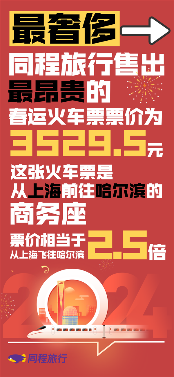 2024年春运期间,有一位旅客通过同程旅行平台预订了上海前往哈尔滨的高铁商务座,票价为3529.5元,相当于上海飞哈尔滨普通航班经济舱价格的2.5倍,是平台上春运期间客单价最高的火车票。可以享受舒适的乘车环境,又能在旅途中看到从南到北逐渐变化的自然风光,也是不一样的体验。