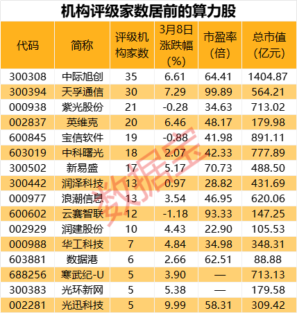 中际旭创、天孚通信、紫光股份评级家数居前,分别为35家、30家、21家。值得注意的是,多只机构关注的概念股预告2023年报盈利高增长,包括中际旭创、天孚通信、光环新网,预告净利润同比增长下限均在50%以上。