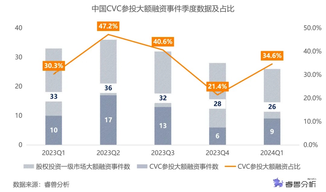 2024Q1,CVC参与投资中国大额融资事件9起(单笔融资额度在1亿美金及以上),事件数量占整个一级投资市场大额融资事件总数(26起)的34.6%。近一年来中国大额融资事件CVC参与度均在20%之上,其中2023Q2的CVC参与度高达47.2%。