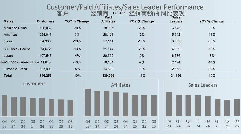 网络整理 2025-11-16 00:26三季度,虽然各市场区域净销售额全线下滑,但如新的经销商领袖数量环比有所增长;中国区业绩4250万美元(约合3亿元人民币),同比下滑20%,中国区经销商人数同比减少20%…
