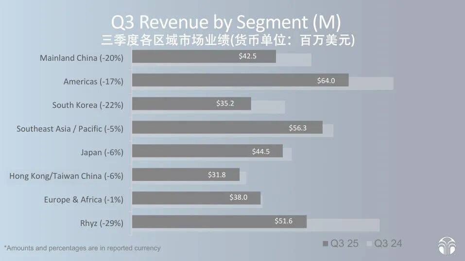 中国区4250万美元的销售额(约合3亿元人民币),同比2024三季度下跌了20%;环比二季度的5320万美元,也减少了超过1000万美元,相当于单季度减少了7100万元人民币的销售额。三季度中国市场业绩占如新全球份额的12%,仅和日本持平,已经落后于美洲的18%和东南亚/亚太区的15%。