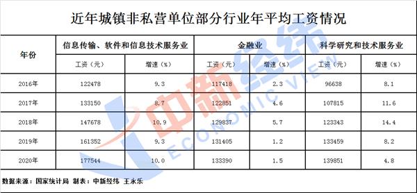 分行业门类看,城镇非私营单位有9个行业的年平均工资超过10万元,比2019年增加了3个。