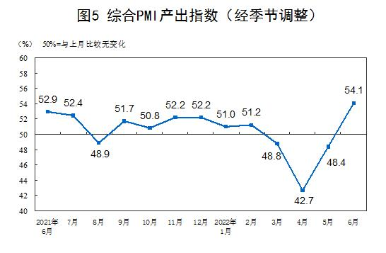 6月份,综合PMI产出指数为54.1%,比上月上升5.7个百分点,表明我国企业生产经营总体呈现恢复性扩张。