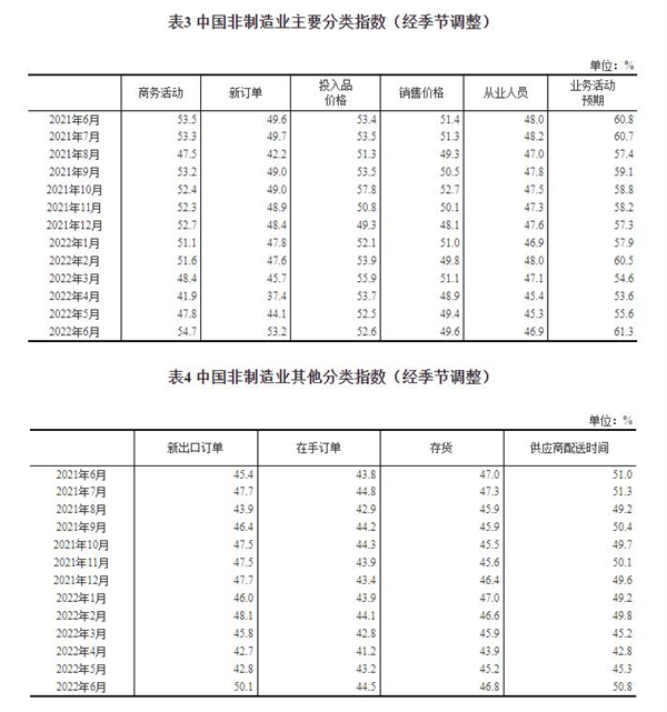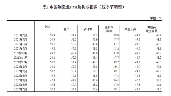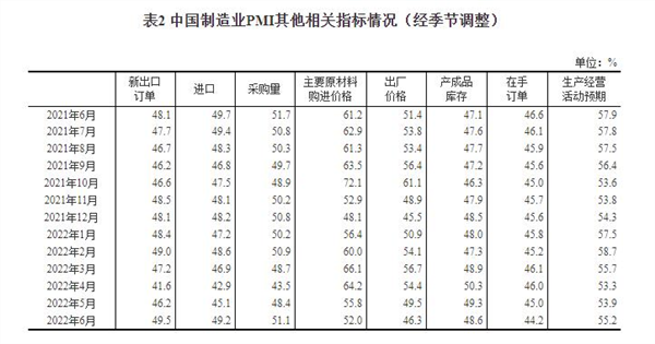 2022年6月中国采购经理指数运行情况