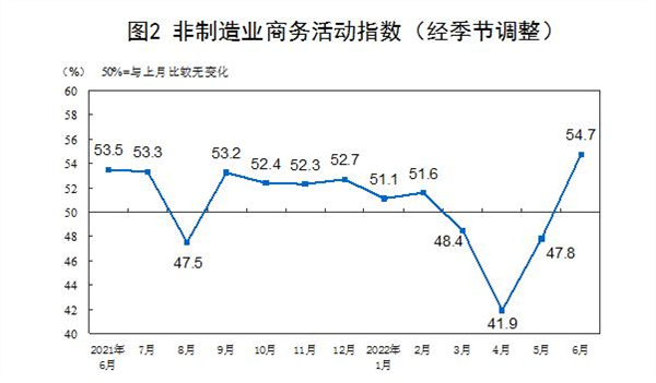 6月份,非制造业商务活动指数为54.7%,比上月上升6.9个百分点,重返扩张区间,非制造业景气水平连续两个月明显回升。