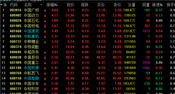 网络整理 2025-11-19 16:117月24日,中字头股票午后走高,中国广核、中国动力涨超4%,中国石化、中国核电、中国建筑、中航重机、中粮糖业、中铁装配涨超3%。