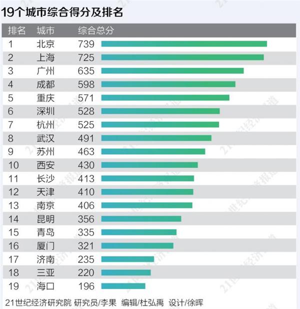 结合商务部相关要求和近两年我国消费发展趋势,21世纪经济研究院在《2021年国际消费中心城市评价报告》中重点选取了19座城市进行系统评价,具体为:北京、上海、广州、深圳、苏州、重庆、成都、武汉、杭州、南京、天津、西安、青岛、济南、长沙、厦门、昆明、海口、三亚。