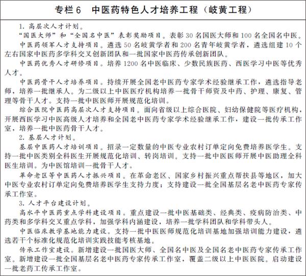 2.强化中医药特色人才队伍建设。实施中医药特色人才培养工程(岐黄工程)。打造岐黄学者品牌,持续开展岐黄学者培养、全国中医临床优秀人才研修等项目,做强领军人才、优秀人才、骨干人才梯次衔接的高层次人才队伍。建设一批高水平中医药重点学科。构建符合中医药特点的人才培养模式,发展中医药师承教育,建立高年资中医医师带徒制度,与职称评审、评优评先等挂钩,持续推进全国名老中医药专家传承工作室、全国基层名老中医药专家传承工作室建设。将综合医院、妇幼保健院等医疗机构中医药人才纳入各类中医药人才培养项目。按照“下得去、留得住、用得上”的要求,加强基层中医药人才队伍建设,根据需求合理确定中医专业农村订单定向免费培养医学生规模,在全科医生特岗计划中积极招收中医医师。推广中医药人员“县管乡用”,探索推进轮岗制与职称评审相衔接。适当放宽长期服务基层的中医医师职称晋升条件,表彰奖励评优向基层一线和艰苦地区倾斜,引导中医药人才向基层流动。