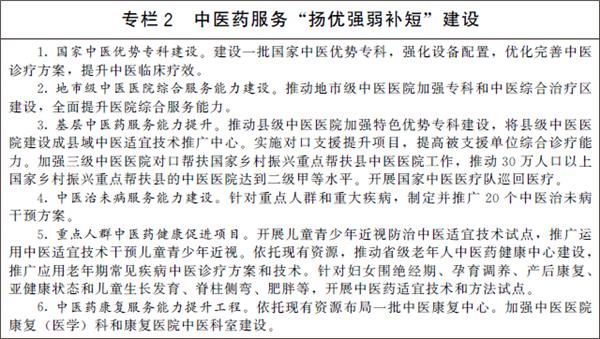 ——中医药服务体系进一步健全。融预防保健、疾病治疗和康复于一体的中医药服务体系逐步健全,中医药基层服务能力持续提升,中西医结合服务水平不断提高,中医药参与新发突发传染病防治和公共卫生事件应急处置能力显著增强。