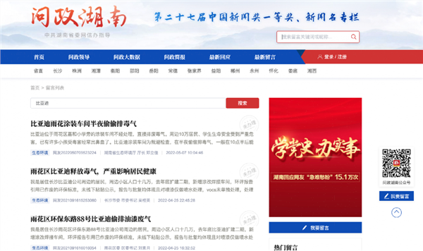 此外,在问政湖南的官网上,也有不少关于比亚迪排放废气的留言举报。