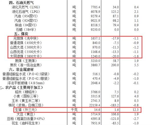 煤炭价格大部分下降,无烟煤(洗中块)价格为1657.1元/吨,环比降1.1%;普通混煤(4500大卡)价格为840.0元/吨,环比降0.9%;山西大混(5000大卡)价格为970.0元/吨,环比降1.2%;山西优混(5500大卡)价格为1168.6元/吨,环比降1.1%;大同混煤(5800大卡)价格为1240元/吨,环比降1.6%;焦煤(主焦煤)价格为3210.0元/吨,环比涨1.9%;焦炭(准一级冶金焦)价格为3860.7元/吨,环比涨5.5%。