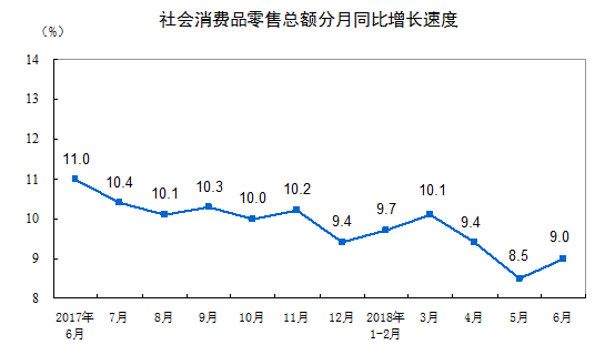 网络整理 2021-03-23 09:372018年6月份社会消费品零售总额增长9.0%