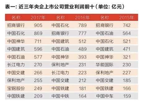 进一步观察发现,2015年到2017年,央企上市公司利润前十名中(见表一),招商银行、中国石化、中国石油、中国神华、中国建筑、保利地产、中国交建和中国铁建等8家每年都榜上有名,表现可以说较为稳定。