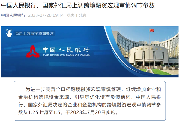 据人民银行官微,为进一步完善全口径跨境融资宏观审慎管理,继续增加企业和金融机构跨境资金来源,引导其优化资产负债结构,中国人民银行、国家外汇局决定将企业和金融机构的跨境融资宏观审慎调节参数从1.25上调至1.5,于2023年7月20日实施。
