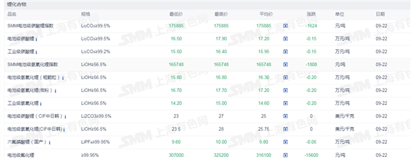 网络整理 2025-09-01 12:14证券之星新能源车行业周报:据上海有色网,截止9月22日,电池级碳酸锂16.5-17.9万元/吨,环比上一工作日下跌1500元/吨;工业级碳酸锂15.5-16.4万元/吨,环比上一工作日下滑1500元/吨。近期随着碳酸锂价格的持续下探,部分锂盐企业制造成本已被击穿,逐步调低开工,产量走低,部分厂家挺价心态渐强,跌幅有所收窄。