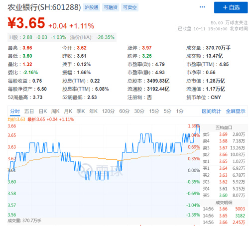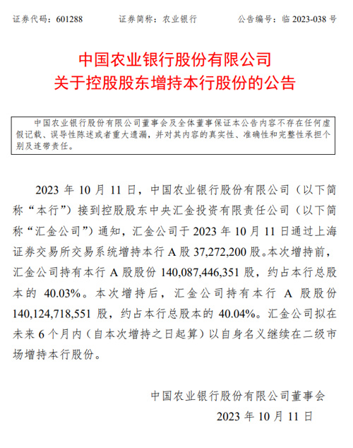 10月11日晚间,农业银行发布关于控股股东增持本行股份的公告称,控股股东汇金公司于10月11日通过上海证券交易所交易系统增持本行A股3727.22万股;汇金公司拟在未来6个月内(自本次增持之日起算)以自身名义继续在二级市场增持本行股份。