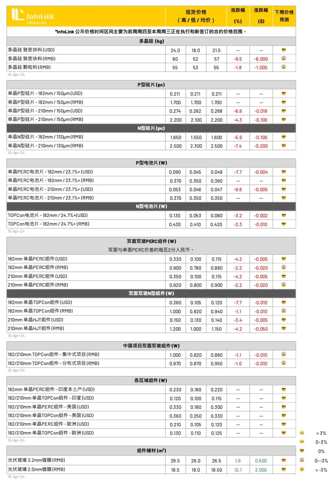 随着厂家在三月末陆续低价出清,以及专业硅片厂家开始执行减产计划,硅片库存最高峰值已过,当前库存呈现缓慢下降的状态,然总量仍维持在40亿片以上。本周起个别头部硅片企业开始酝酿涨势,尝试性的报价182N硅片调整到每片1.63-1.65元人民币左右,然而考量行业库存量体与开工,硅片环节价格后势仍然悲观看待。