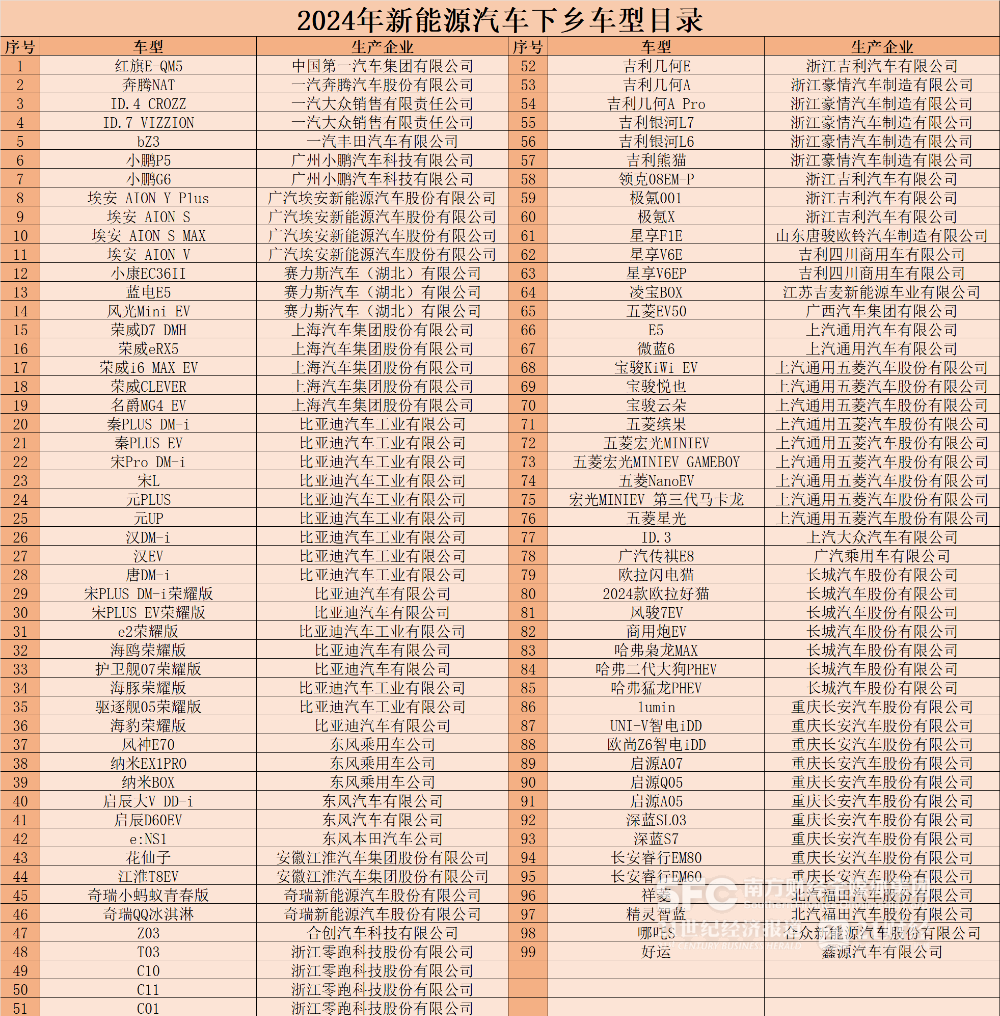 记者注意到,2024年新能源汽车下乡活动的车型共有99款,较上一年活动增加30款。生产企业包括一汽、广州小鹏、广汽埃安、比亚迪、吉利、赛力斯、东风、江淮汽车、奇瑞新能源等,可选车型和企业数量都更为丰富。