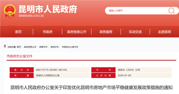 7月8日,昆明印发了《关于优化昆明市房地产市场平稳健康发展政策措施的通知》,新规包含优化供给结构、加强项目规划服务、提升要素保障质效、推动存量住房去化等5个方面,共25条主要措施。