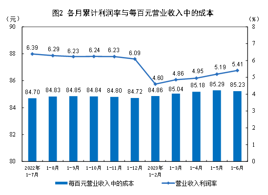 1—6月份,规模以上工业企业每百元营业收入中的成本为85.23元,同比增加0.81元;每百元营业收入中的费用为8.34元,同比增加0.25元。