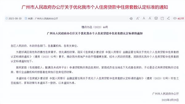 8月30日上午,广州市人民政府办公厅发布《关于优化我市个人住房贷款中住房套数认定标准的通知》。