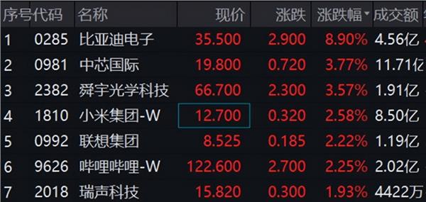 港股市场今日高开:恒指涨0.95%,恒生国企涨0.98%,恒生科技涨1.54%。早间中芯国际涨超4%,领涨蓝筹股。上午港股冲高回落,比亚迪电子领涨恒生科技。