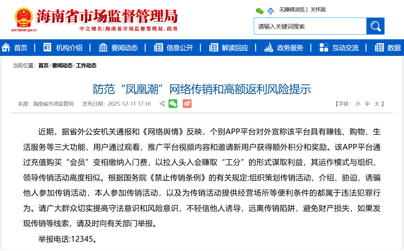 ●海南省市场监管局发布防范“凤凰潮”网络传销和高额返利风险提示
